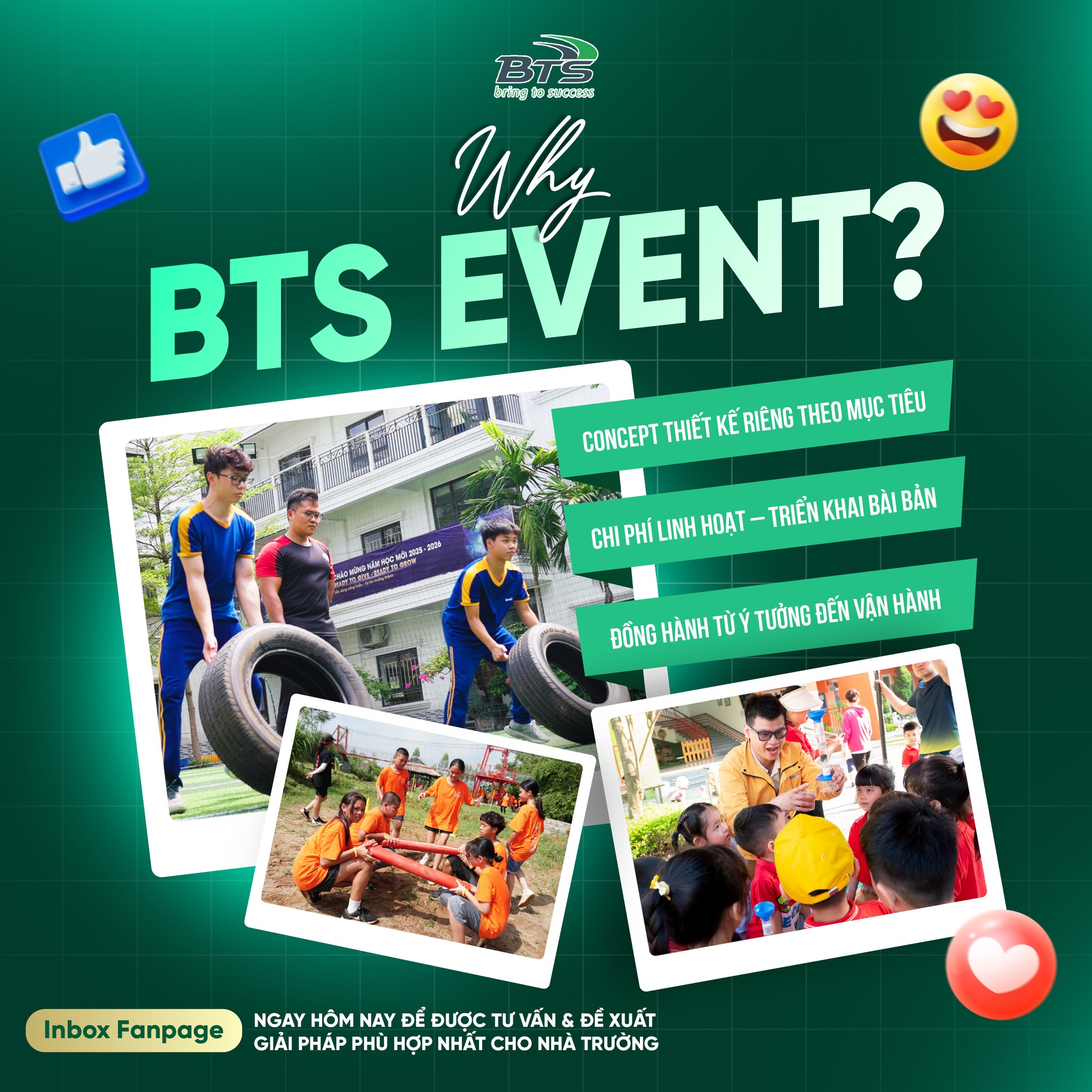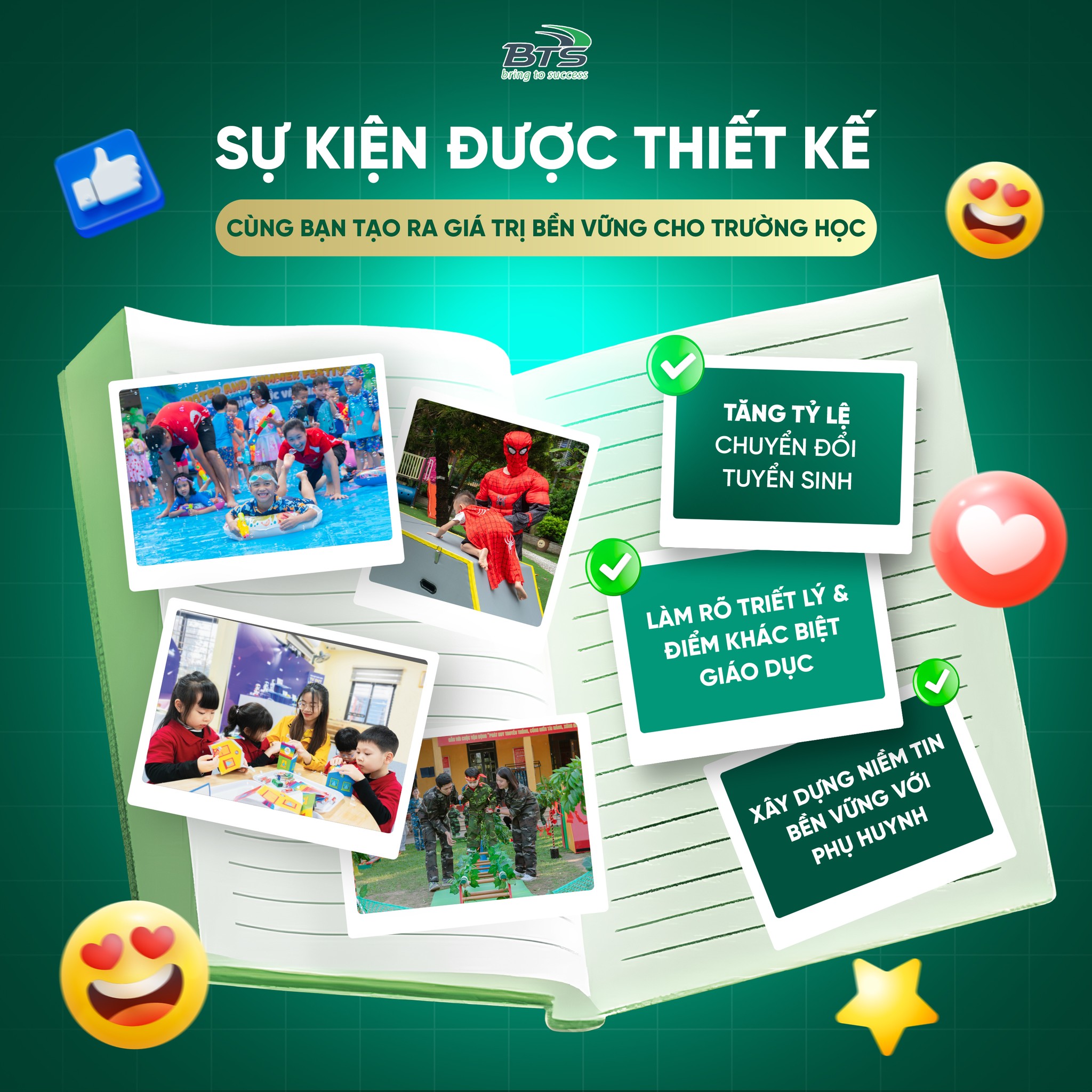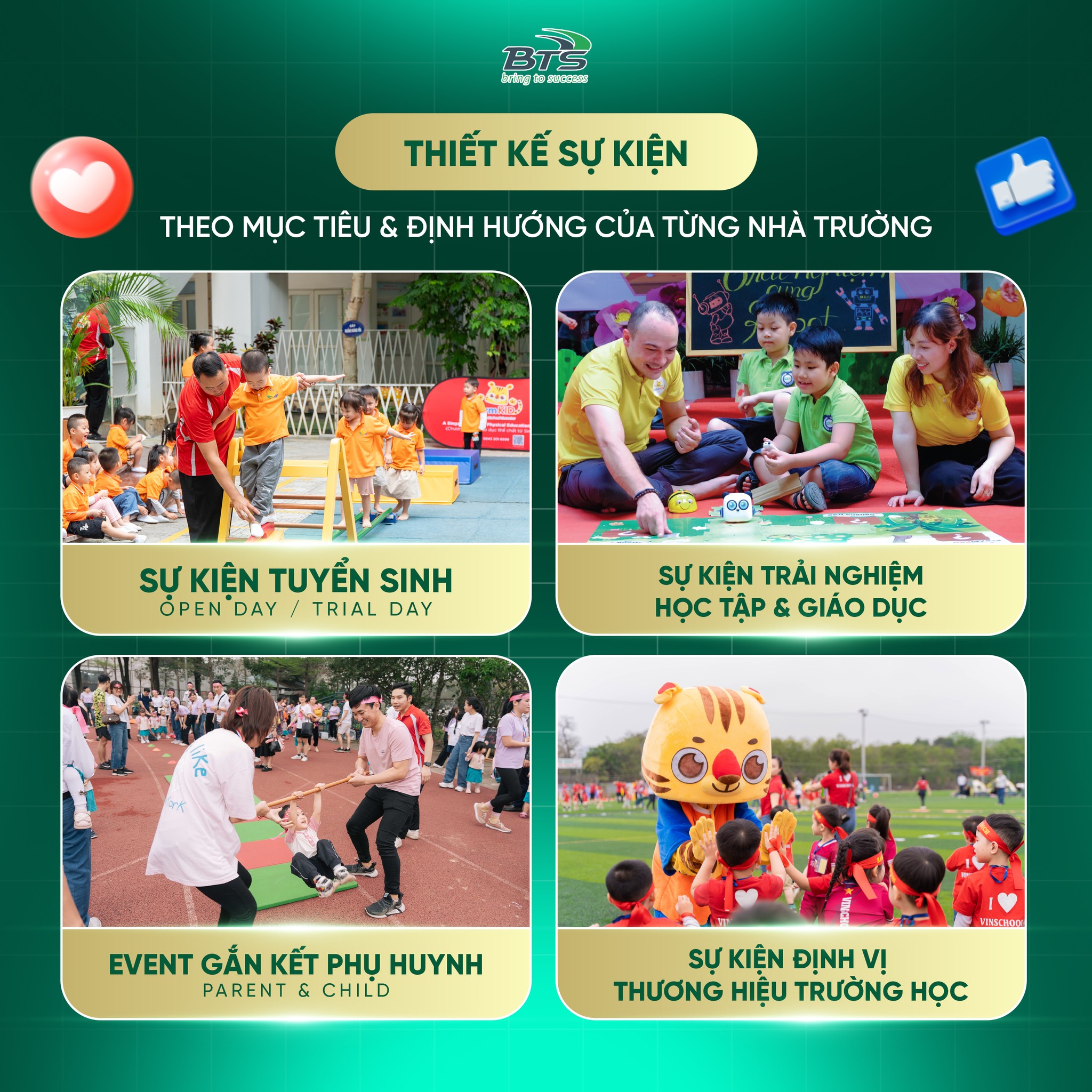 BTS Edu Event mang đến giải pháp tổ chức sự kiện giáo dục & thể chất được thiết kế bài bản theo mục tiêu tuyển sinh và định vị thương hiệu của từng trường, dựa trên chuyên môn giáo dục và trải nghiệm học tập thực chất.
